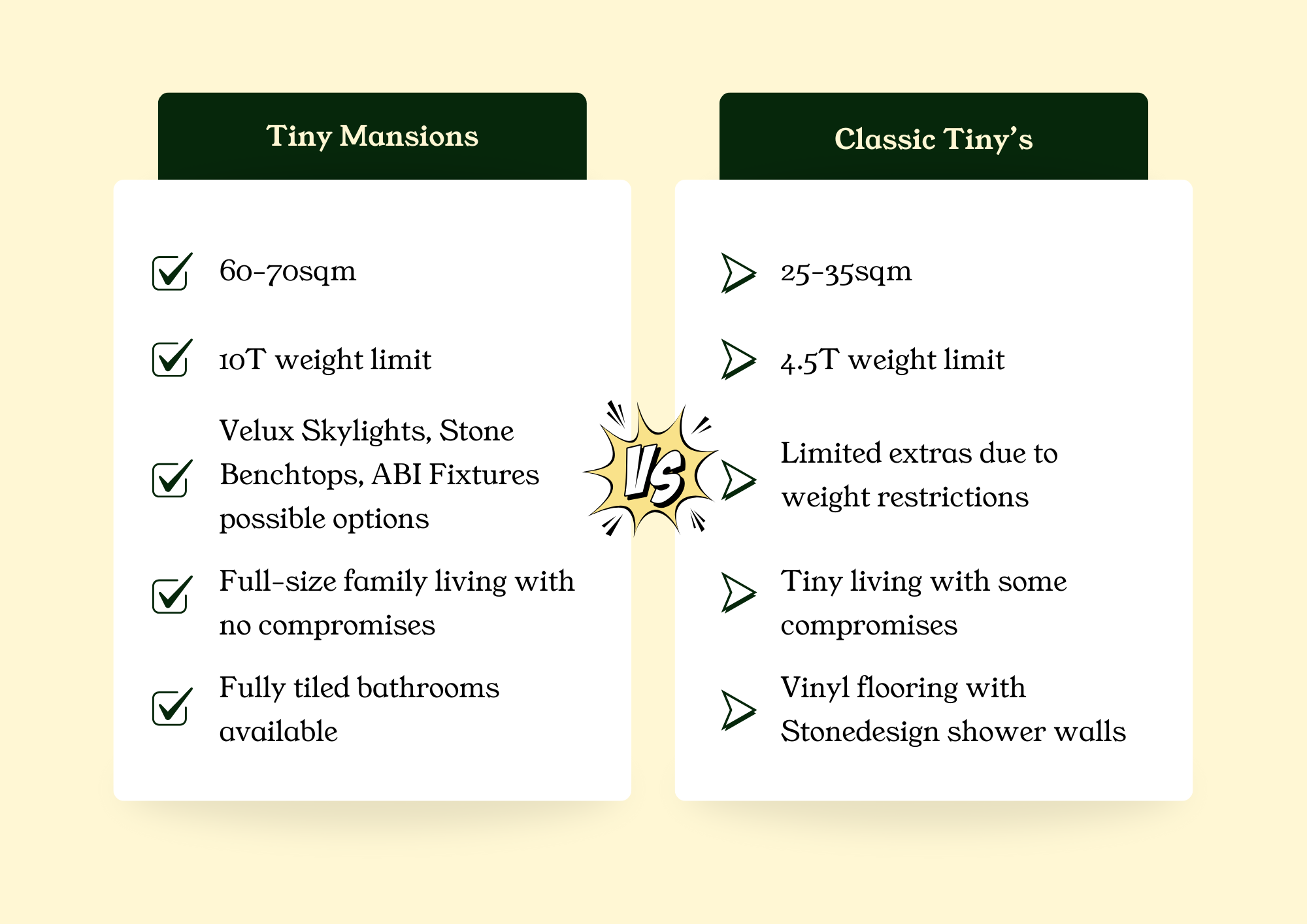 Tiny Mansions are different. They’re 60–70 sqm homes on wheels, engineered with a heavier-duty chassis and structure so you can add stone benchtops, skylights, full tiling, extra joinery and more without pushing the home past what’s safe or legal.